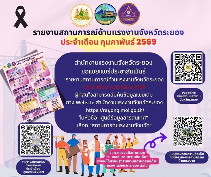 สำนักงานแรงงานจังหวัดระยอง ขอเผยแพร่ประชาสัมพันธ์รายงานสถานการณ์ด้านแรงงานจังหวัดระยอง ประจำเดือน กุมภาพันธ์ 2569